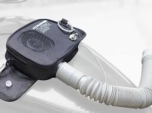 La bolsa de depósito Komine es una bolsa pequeña que contiene el ventilador turbo, y también tiene un bolsillo pequeño donde guardar la batería opcional. Se instala fácilmente en el tanque de la moto y la manguera que va conectada, de tipo acordeón y de longitud expandible, es introducida en la prenda que queramos refrigerar.