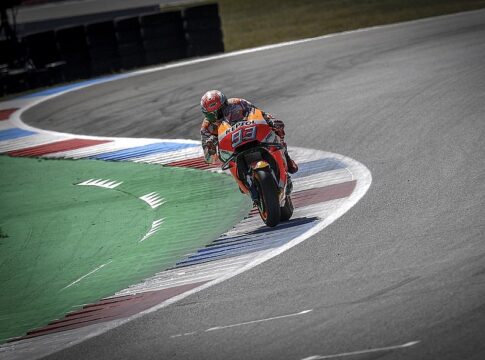 ¿Qué ocurre después de pasar por la curva? Pues que aceleramos, suavemente si vamos en carretera, y gas a fondo cuando eres un piloto de carreras rodeado de otros que intentan ganarte… como en Assen. En ese momento la moto está inclinada y buscas levantarla lo más rápido posible para poder dar más gas. Es obvio que con el neumático apoyado en un flanco no podremos acelerar tan fuerte: porque el agarre es peor (hay menos peso sobre la rueda trasera) y porque en las MotoGP la electrónica sabe que la moto está inclinada y controla la cantidad de potencia disponible.