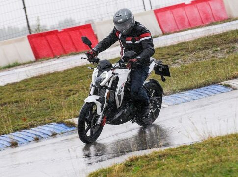 Probar estas motos en un circuito y con tanta lluvia tenía su punto, y podía haber acabado en susto o algo más, o eso pensé antes de atreverme a lanzarme al ruedo, pensando también en los neumáticos Cordial que montan y que no van precedidos de una gran fama en mojado… El caso es que mi conclusión, después de estar dando vueltas a ver si los fotógrafos acertaban a pillarme entre charcos, es muy buena. Mirando atrás y repasando mis notas posteriores me llama la atención que con la Keeway RKF no sólo no tuve ni un solo “aviso” sino que acabé animándome a rodar a buen ritmo. El nuevo motor refrigerado por agua realmente tiene un tacto más lineal, más “lleno” de lo que recuerdo habitual en estas motos, que suelen exigir llevar el motor en la parte alta del cuentavueltas para moverse con agilidad: buen tacto motor y también del conjunto cambio/embrague. Los frenos combinados no me dieron tampoco de qué preocuparme y las suspensiones no me llamaron la atención por demasiado incómodas ni muy blandas (con asfalto seco habría sido otro cantar seguramente).